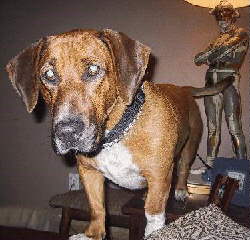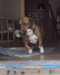 It took me a few months to get used to my new surroundings and come out of my shell, but now I feel right at home and I guard Liz's back yard from squirrels and birds just as if I've always lived here. I always try to be well behaved, and I even got to go to work with Liz for a few days. Now she says everyone there wants her to bring me back. When I got there I just laid down contentedly and I never fussed or bothered anyone. Of course I'm a lot more energetic than that when I'm home.