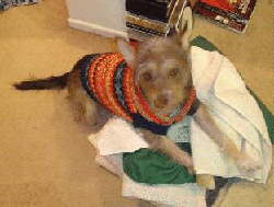 Meanwhile, it turns out I'm a bit more than a "lap dog"! Though I settle down to be what my Mom considers to be the cutest couch potato, I've also got a mischievous side! Once I got all settled into my new home, I invented the game of carrying pieces of laundry from room to room (but since I'm a good dog, I never chew them).